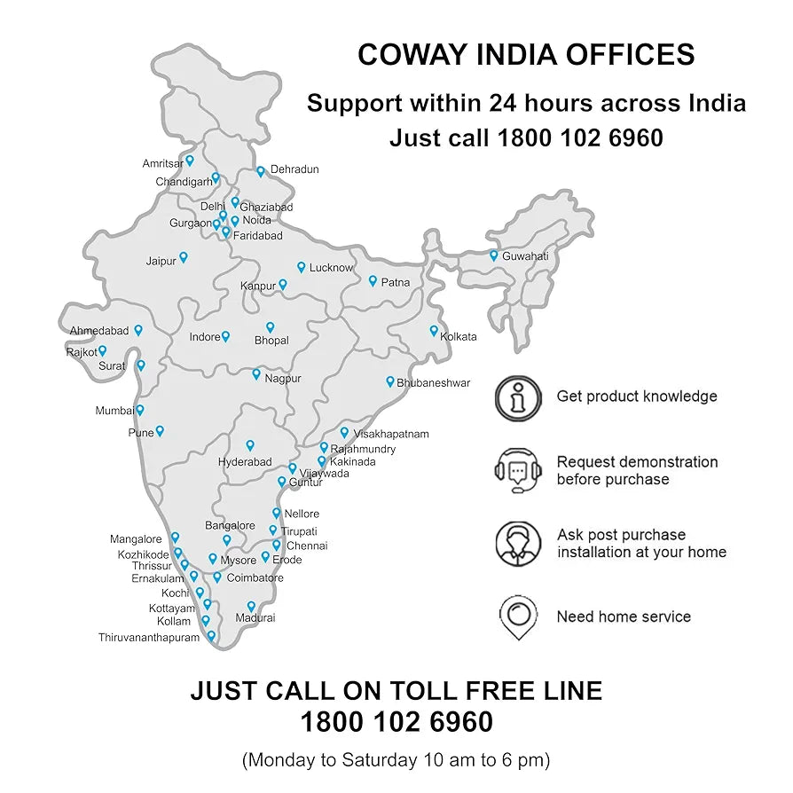 • Door-step Services: With over 90 dedicated offices across India, Coway provides door-step service for all users. We offer free installation and home service, ensuring customer needs are prioritized. Simply reach out via our toll-free number for assistance with demonstrations and any service requirements.