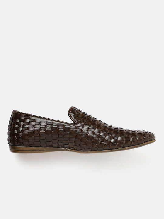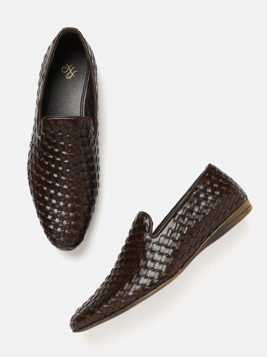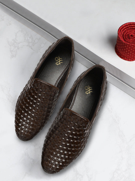House of Pataudi Men Coffee Brown Basketweave Handcrafted Leather Slip-Ons
