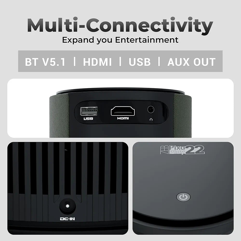- High Definition and Connectivity: Native 720p resolution ensures clear and crisp images. The PIXAPLAY 22 supports a wide range of multimedia formats including MOV, AVI, H.264, MP4, MKV, FLV, MPEG 1, and MPEG 2. Connect your devices effortlessly via Bluetooth, HDMI, USB, or the AUX output.